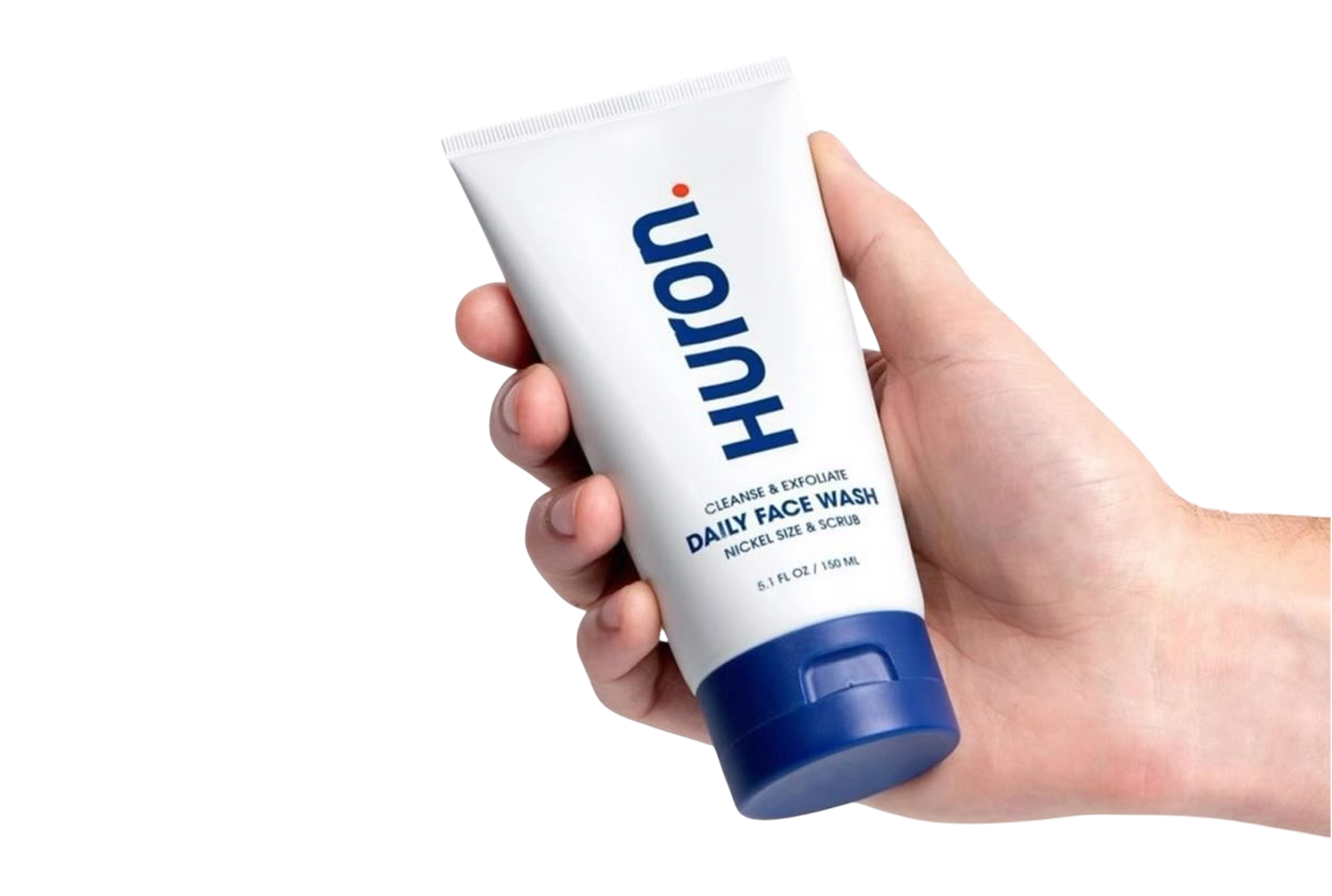 Bottle of Huron conditioner with text: "Huron. CONDITIONER" A person pouring conditioner from a travel-size bottle into their hand.