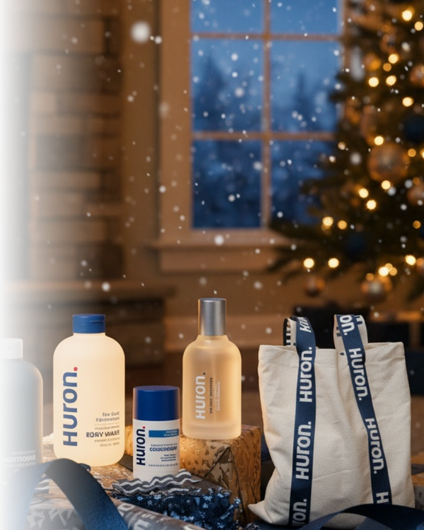 Three Huron deodorant sticks labeled Original Citrus + Eucalyptus, Sea Salt + Driftwood, and Sandalwood + Amber, each with 48 hour protection and aluminum-free formula. Deodorant 3-Pack
