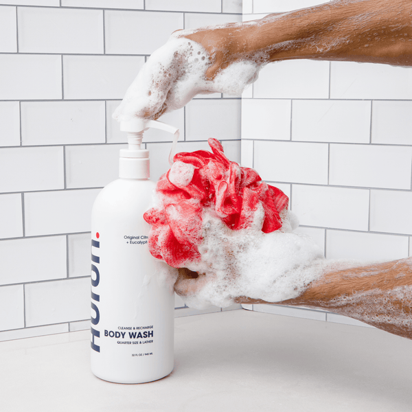 Huron Body Wash in Sea Salt Driftwood scent, labeled 'NEW SCENT' Person using Huron body wash in a shower, lathering it on a loofah.