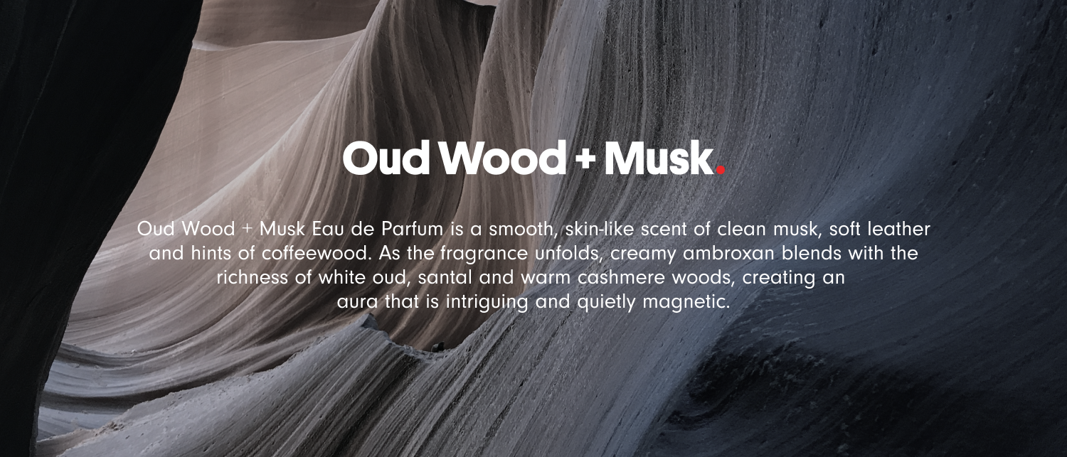 Oud Wood + Musk: Clean musk, soft leather and hints of coffeewood blend with creamy ambroxan and rich white oud for a scent that is smooth and confident. Subtle notes of santal and warm cashmere woods add dimension, creating an aura that is intriguing and quietly magnetic.